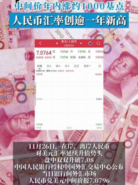中间价年内涨约1000基点—人民币汇率创逾一年新高! #人民币 #汇率