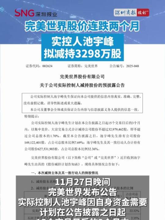完美世界股价连跌两个月,实控人池宇峰拟减持3298万股 #完美世界 #股市