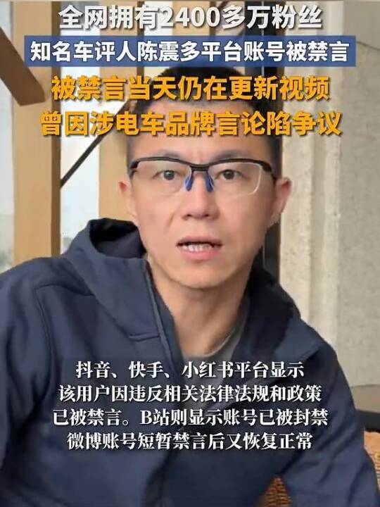 全网拥有2400多万粉丝的知名车评人陈震多平台账号被禁言(荆楚网、极目新闻)