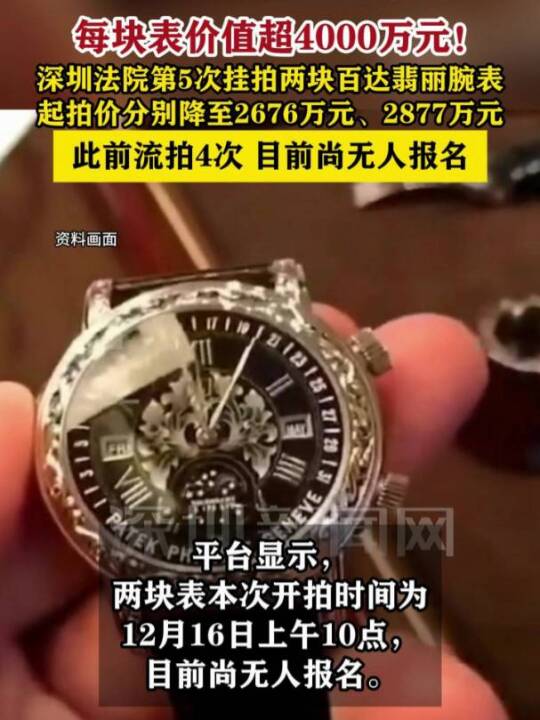 每块表价值超4000万元! 深圳法院第5次挂拍两块百达翡丽腕表,起拍价分别降至2676万元、2877万元,此前流拍4次,目前尚无人报名。(来源:极目新闻 编辑:刘斐斐 校审:周浩桦 叶青)