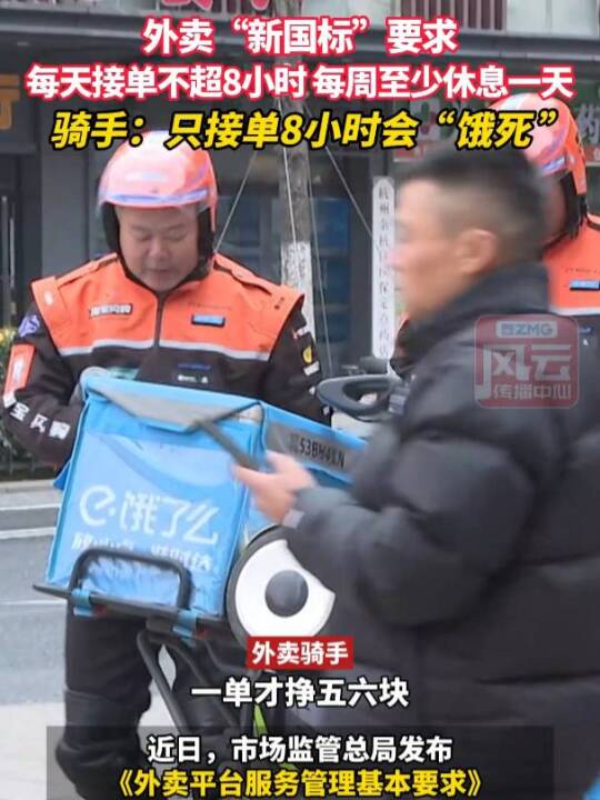 外卖“新国标”要求每天接单不超8小时,每周至少休息一天,骑手:只接单8小时会“饿死”。(浙江广播电视台 浙江经视)