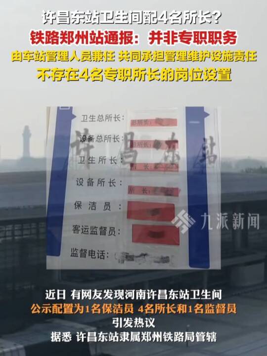 12月6日,#官方通报许昌东站卫生间配4名所长: 并非专职职务,由车站管理人员兼任,共同承担管理维护设施责任,不存在4名专职所长的岗位设置。(九派新闻)