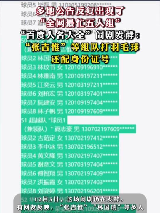 多地公告反复出现了“全网最忙五人组”,“百度人名大全”闹剧发酵:“张吉惟”等组队打羽毛球,还配身份证号(澎湃新闻)