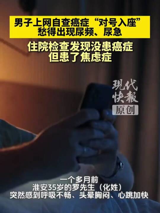 男子上网自查癌症“对号入座”,愁得出现尿频、尿急,住院检查发现没患癌症,但患了焦虑症(现代快报)