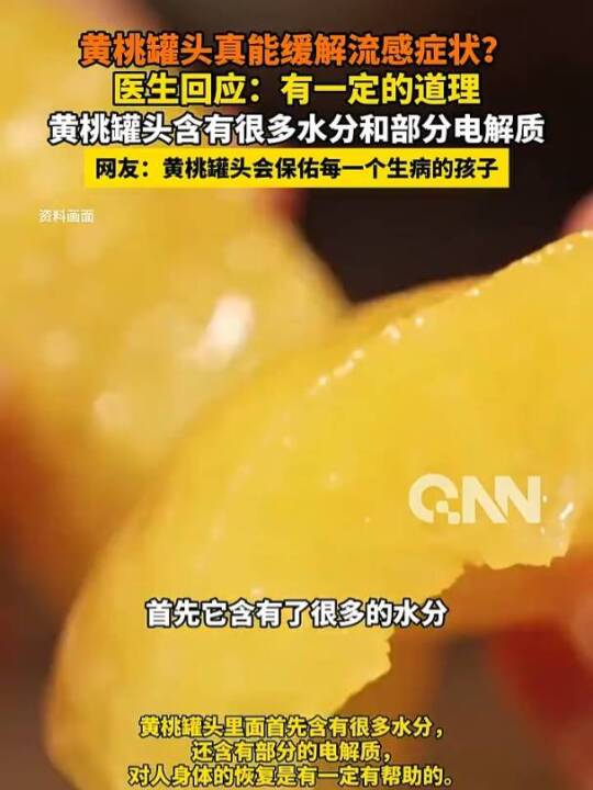 #黄桃罐头真能缓解流感症状 ?医生回应:有一定的道理,黄桃罐头含有很多水分和部分电解质(杭州网、极光新闻)