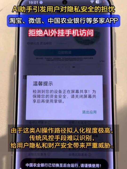 淘宝、微信、中国农业银行、中国建设银行等App先后出现了针对AI手机屏幕共享监测以及风控措施,此举被网友解读对豆包AI手机助手凭借底层权限、实现跨应用操作所引发隐私担忧的回应。