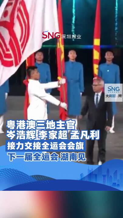 粤港澳三地主官岑浩辉 李家超 孟凡利,接力交接全运会会旗,下一届全运会,湖南见!来源:羊城晚报 #活力大湾区相约十五运#