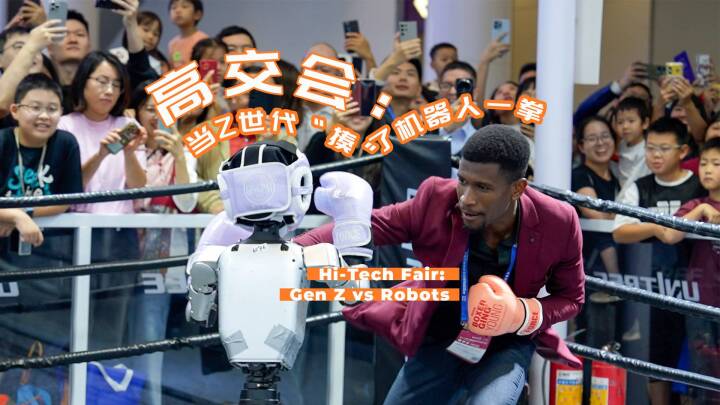 高交会人“机”拳击赛 | 在第27届高交会上,宇树科技展位会拳击的机器人吸引了大批目光,外国友人也加入了和机器人的拳击赛一较高下。At the 27th China Hi‑Tech Fair, the boxing robots at Unitree's booth draw big crowds — even expats step into the ring to spar with th