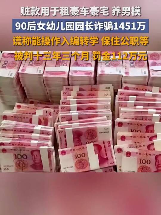 “90后”幼儿园园长诈骗1451万租豪车养男模,谎称能操作入编转学、保住公职等难办之事,被判十三年三个月,罚金112万元。(扬子晚报、荆楚网)