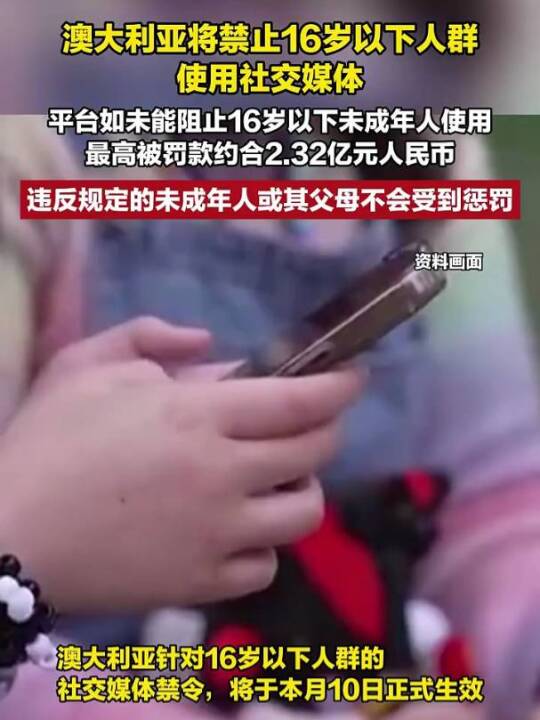 澳大利亚将禁止16岁以下人群使用社交媒体 平台如未能阻止16岁以下未成年人使用 最高被罚款约合2.32亿元人民币 (新京报、央视新闻)