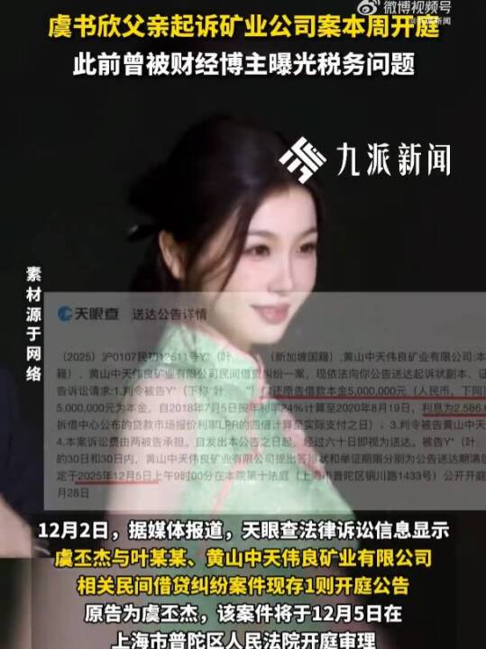 虞书欣陷家族财富等争议,已掉粉超300万。其父虞丕杰借贷纠纷案12月5日开庭,虞书欣至今未公开回应。(九派新闻)
