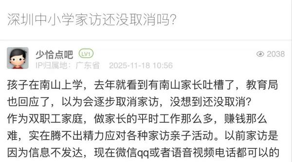 近日,有家长在《问政深圳》发帖称“深圳中小学家访还没取消吗?”该家长表示,孩子在南山上学,作为双职工家长,实在腾不出精力应对各种家访亲子活动。