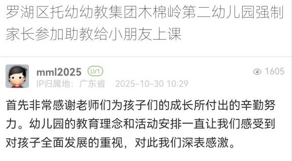 近日,有家长在《问政深圳》平台发帖反映,罗湖区托幼幼教集团木棉岭第二幼儿园强制家长参加助教给小朋友上课。
