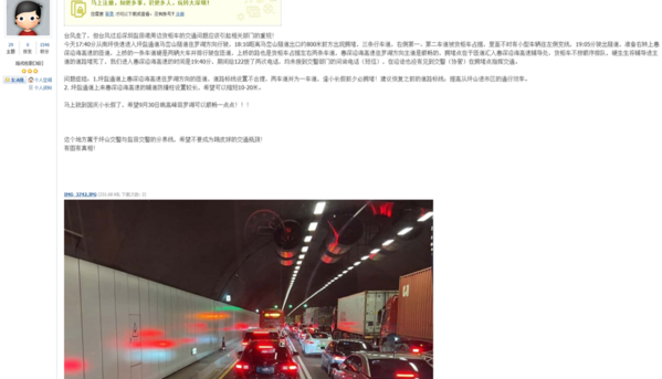 近日,有网友在深圳论坛发帖称,台风过后,坪盐通道马峦山隧道往罗湖方向拥堵,多处出现货柜车并排占道通行现象,建议相关部门予以重视,通过合理设置道路标线,加强交通引导管控,提升道路通行效率。