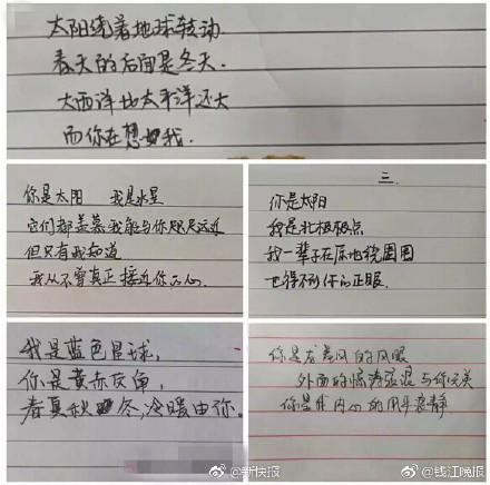【不好好学习连情书都看不懂了!杭州00后的恋爱表白脑洞大开】这是杭州二中高一学生的一份地理作业:根据一学期的地理知识所学,撰写地理三行情书。布置这份作业的地理老师程锋感慨:现在小朋友们远比我们想象中要成熟,感情丰富。每个孩子都是创造者,可以将枯燥的课本知识,创造成情感饱满的诗歌。除了地理,学生们还流行用数学、化学写情书。