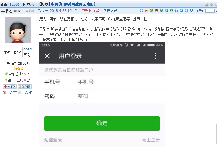 在帖文中,该网友称了解到目前去中英街需要提前网上预约,于是关注了“在盐田”、“畅游盐田”两个微信公众号。进入预约界面后要“短信登陆”或者“马上注册”,但是选项均为不可用的“灰显”,无法完成注册、预约。“周末不能预约吗?”网友产生了这样的疑问。