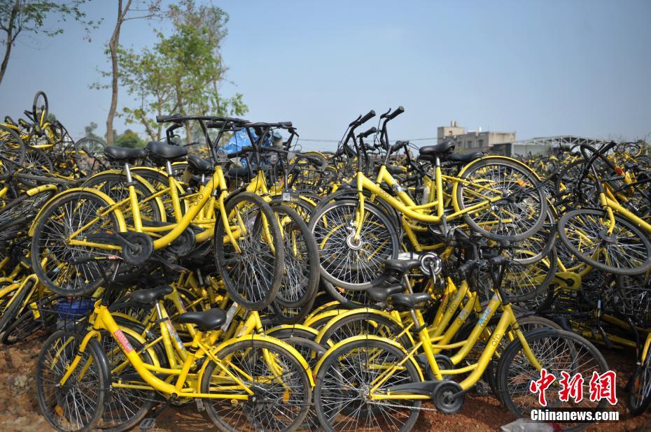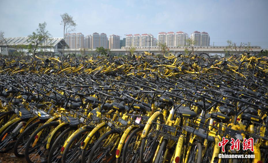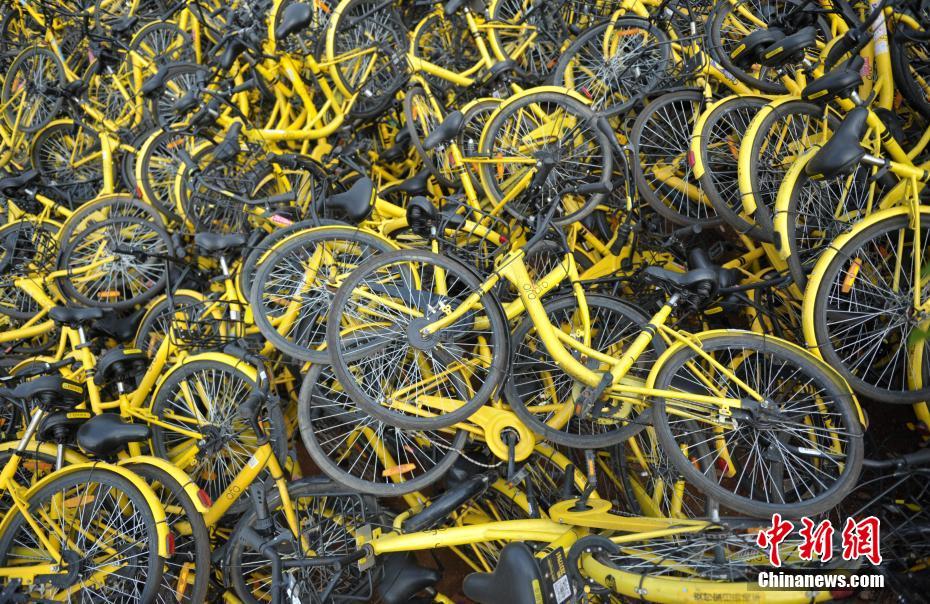 6月7日,成都一停车场内堆放了不少共享单车,大多数车锁已被拆除,这些单车系临时回收、维修中转车辆。中新社记者 刘忠俊摄