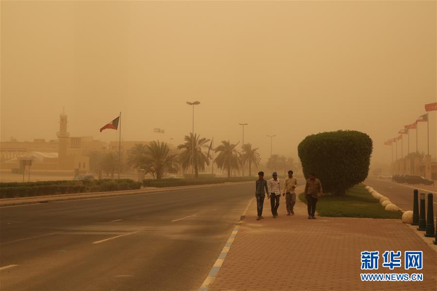 6月17日,人们走在黄沙弥漫的科威特首都科威特城中。科威特17日遭遇沙尘暴袭击。 新华社记者聂云鹏 摄