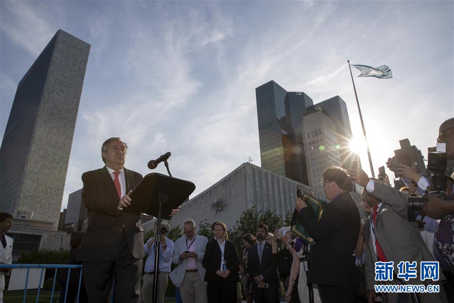 6月26日,在位于纽约的联合国总部,联合国秘书长古特雷斯(前左)在联合国记者协会成立70周年庆祝活动上致辞。