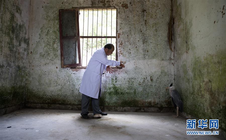8月6日,在江西省九江市都昌县多宝乡鄱阳湖候鸟救治医院,院长李春如在和一只接受救治的苍鹭“对话”。