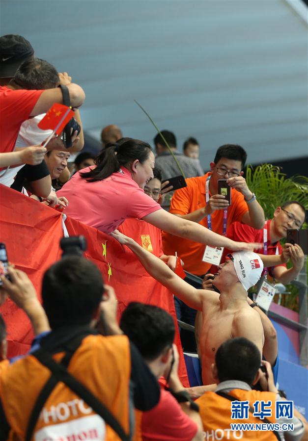 8月19日,中国选手孙杨(右)在赛后庆祝。