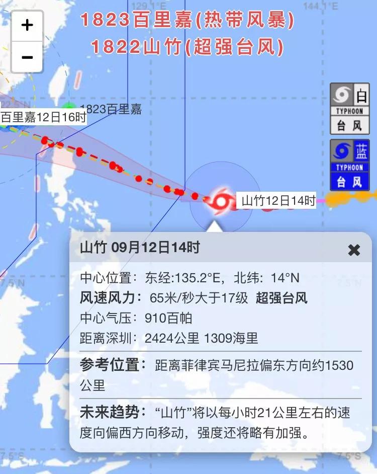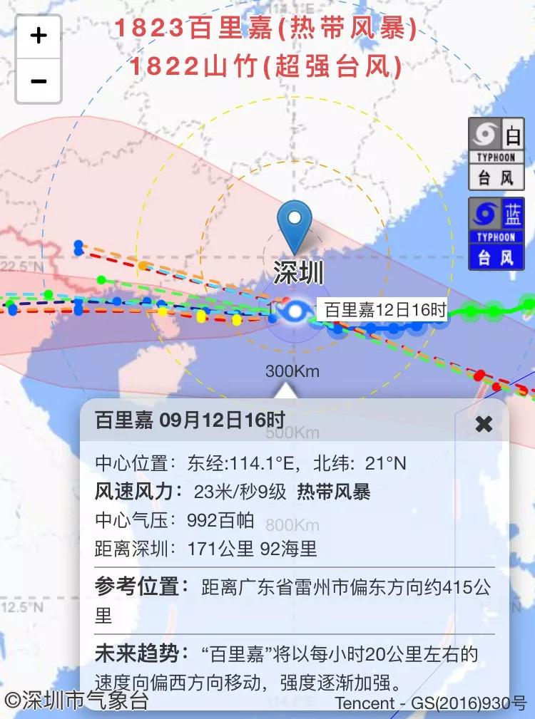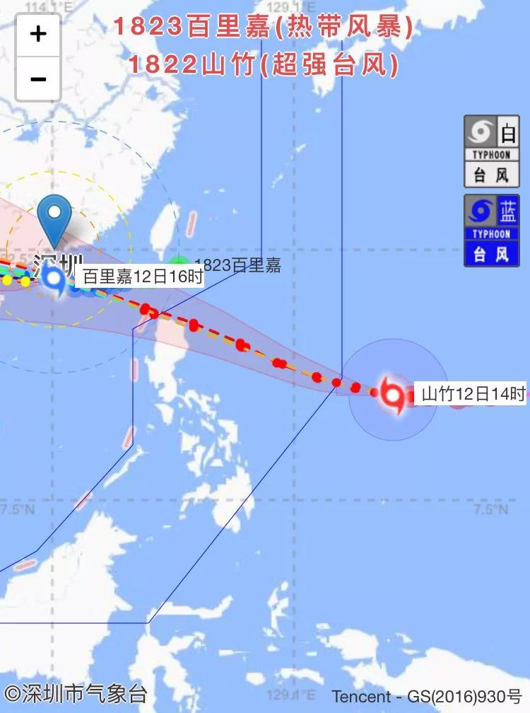 此外,今年第22号台风“山竹”(超强台风级)12日05时位于深圳市东南方约2581公里的西北太平洋洋面上。未来将以20-25公里的时速向西方向移动,15日进入南海,16-17日严重影响广东,将对深圳市造成严重风雨影响。