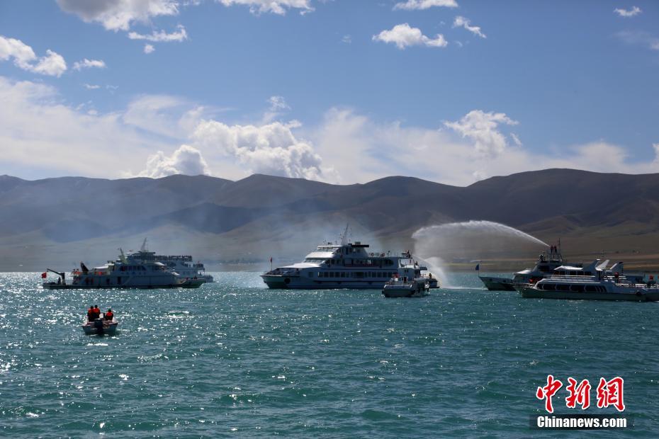 9月20日,青海湖2018年水上联合应急搜救演练在二郎剑景区附近水域举行。本次演练历时90分钟,共有33艘船艇,200余人参加。图为船舶消防演练。中新社记者 罗云鹏 摄