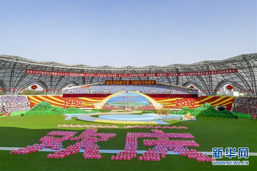 9月20日,宁夏回族自治区成立60周年庆祝大会在银川贺兰山体育场隆重举行。这是庆祝大会上的群众文艺表演。 新华社记者 沈伯韩 摄