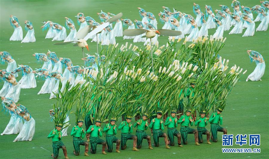 9月20日,宁夏回族自治区成立60周年庆祝大会在银川贺兰山体育场隆重举行。这是庆祝大会上的群众文艺表演。 新华社记者 陈建力 摄