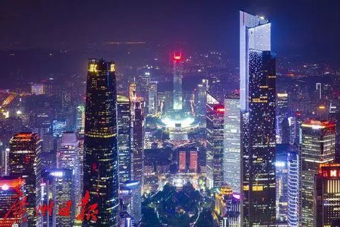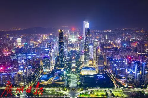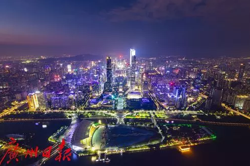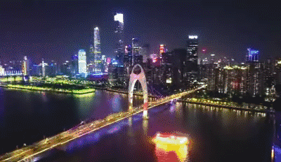 珠江沿岸高楼群亮起的流动夜光画卷,