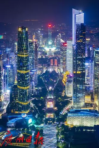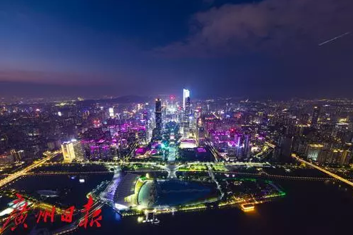 △入夜后的广州璀璨夺目,从广州塔顶端俯瞰珠江北岸的珠江新城,夜景美轮美奂。(广州日报全媒体记者苏俊杰摄)