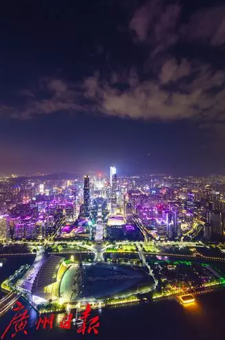 璀璨灯光之中,位于珠江南岸琶洲西区,与猎德大桥上灯光相映成趣的“新城中轴地标首席文化标杆”广州日报新大楼广报中心在夜幕下闪耀着各种颜色。