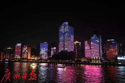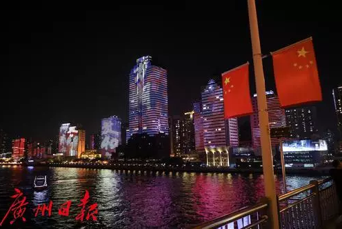 而无论是广州塔“小蛮腰”,还是在珠江穿梭的游船,也都一同“点亮”灯光,亮起了“壮阔东方潮,我爱你中国”等彩色标语。