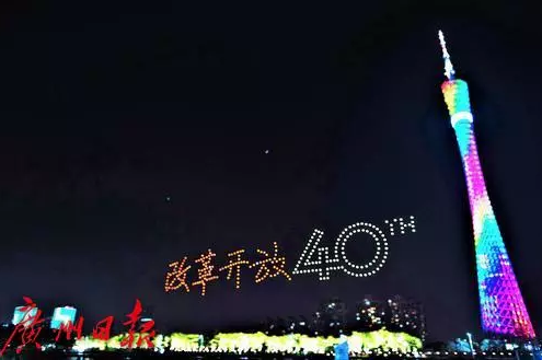 尤其是无人机编队组成的3D立体广州塔造型,和小蛮腰双塔辉映,令人惊艳;从1978到2018,无人机编队组成的数字快速变幻,浓缩出改革开放40年的征程。
