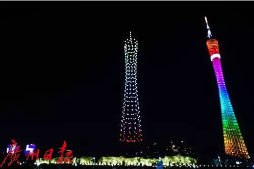 △2018年10月1日,广州海心沙广场,无人机编队翩翩起舞庆国庆(广州日报全媒体记者王维宣摄)