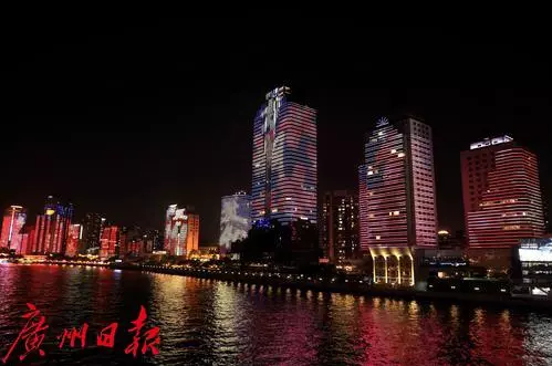 沿着珠江从海珠桥一路往东行,画面每15秒切换一次,犹如夜幕下的一幅大型动态夜光画卷。