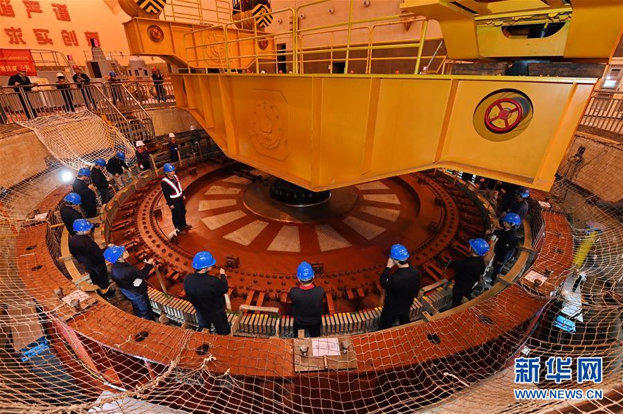 11月23日,福建水口水电站技术人员起吊5号发电机转子。