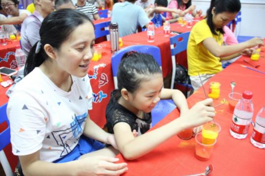 活动上,主讲老师就党建知识切入主题,带领着每一户军人家庭亲子间互动协助,体会沙瓶画艺术的奥妙。小朋友们在爸爸妈妈的引导下,渐渐在玻璃瓶中勾勒出心形图案,接着用专用勺子慢慢将黄色与红色沙子灌入其中,一层层堆砌,最终呈现出一颗黄心封存在满瓶红沙中的效果。