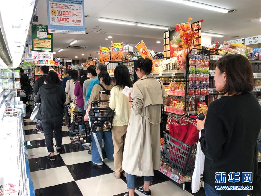 10月11日,在日本东京一家超市,抢购商品的人们排队结账(手机拍摄)。据日本气象部门预测,今年第19号台风“海贝思”将于11日至13日接近并登陆日本。新华社记者马曹冉摄