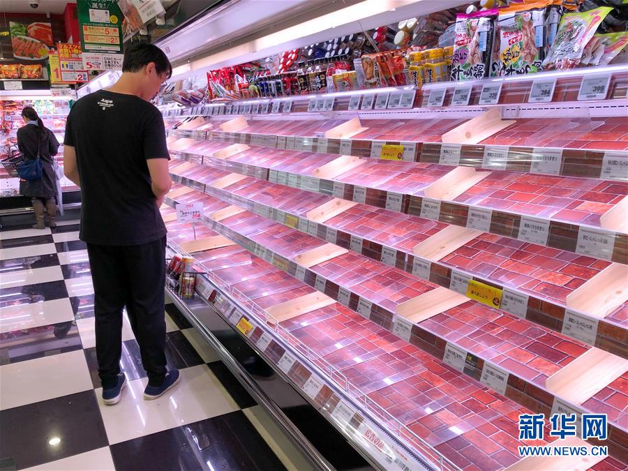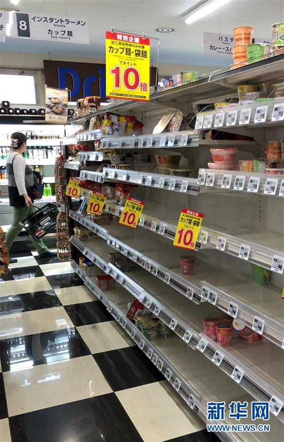 10月11日,在日本东京一家超市,部分食品类商品被抢购一空(手机拍摄)。据日本气象部门预测,今年第19号台风“海贝思”将于11日至13日接近并登陆日本。新华社记者马曹冉摄