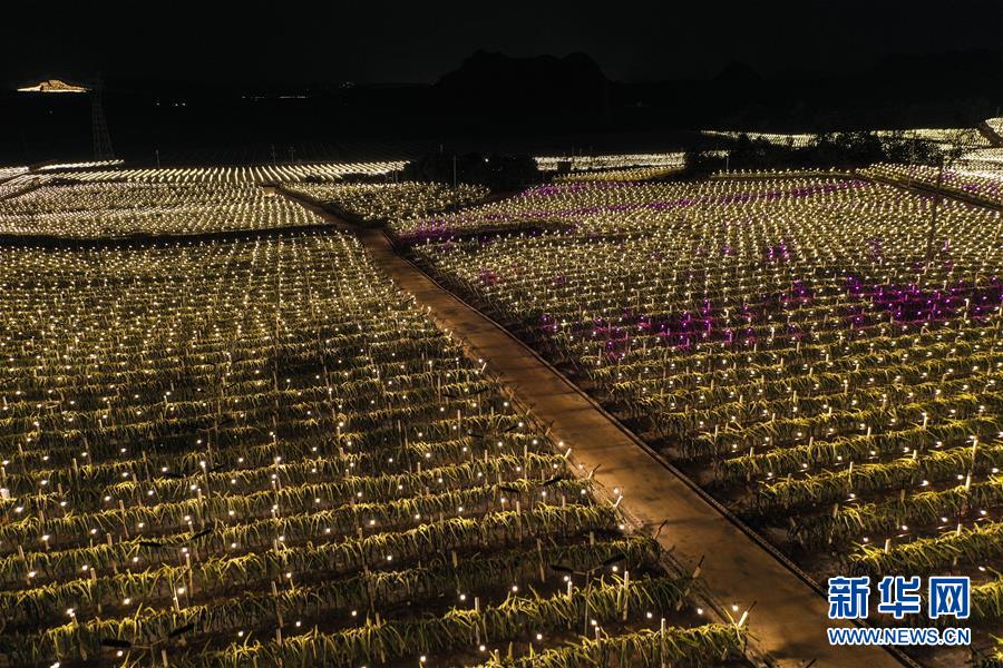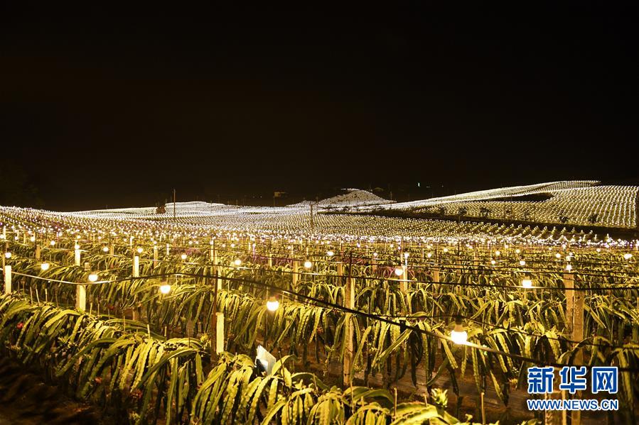 广西隆安县一处安装有灯光补给系统的火龙果种植基地在夜晚点亮补给灯(10月15日摄)。新华社记者曹祎铭摄