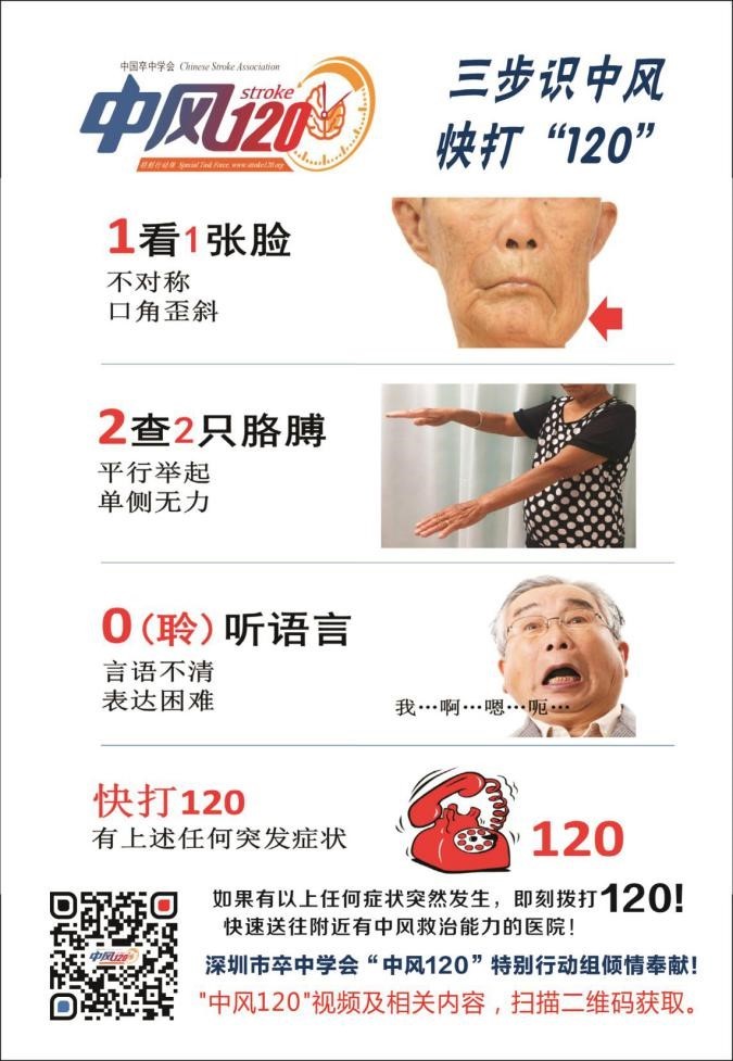 掌握“中风120”,快速识别脑卒中。“1”代表“看到1张不对称的脸”;“2”代表“查两只手臂是否有单侧无力”;“0”代表“聆(零)听讲话是否清晰”。如果通过这三步观察怀疑患者是中风,可立刻拨打急救电话120。