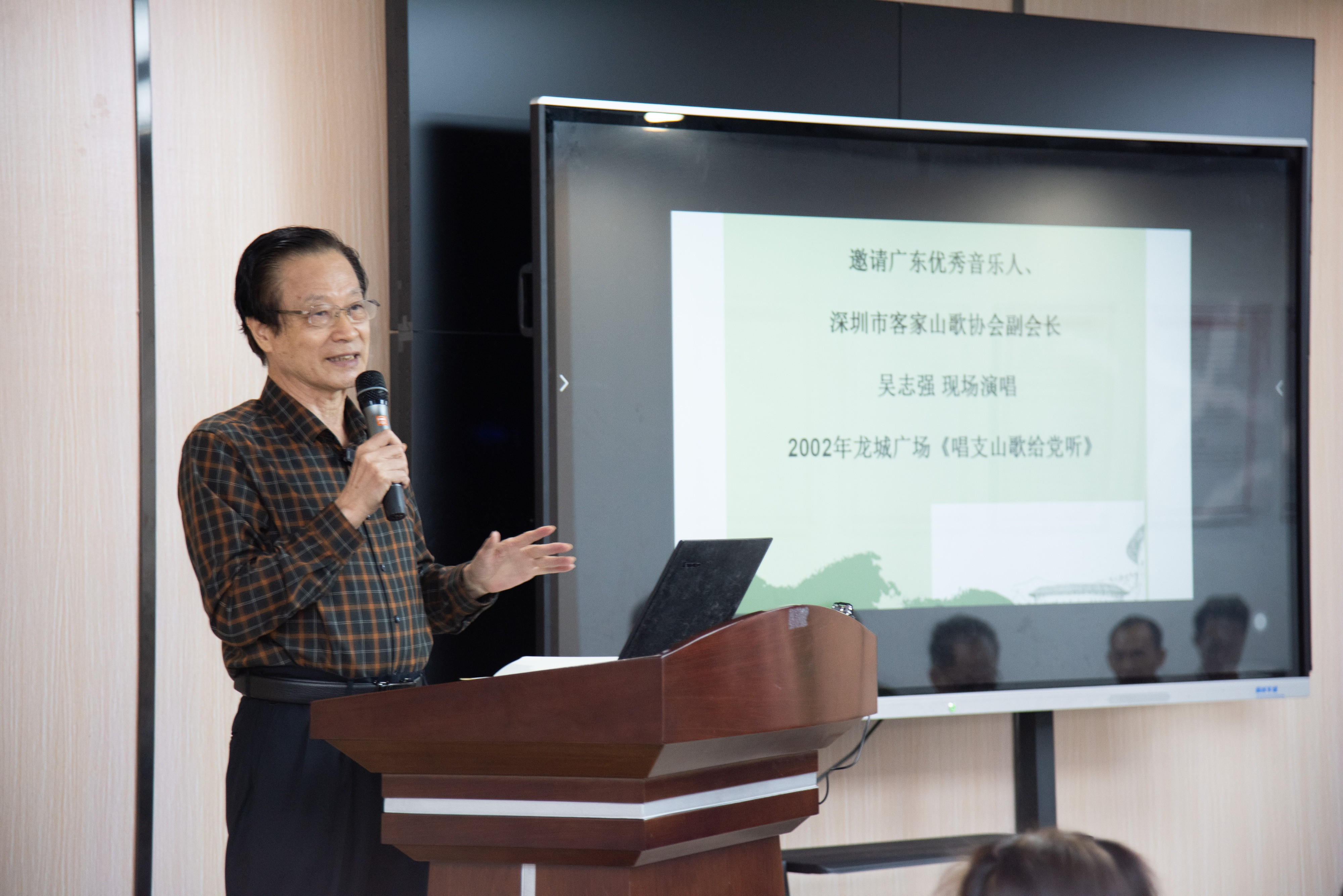 讲座由深圳首批文艺名家工作室“杨宏海客家文化与艺术工作室”领衔人、深圳市民间文艺家协会名誉主席、深圳市客家山歌协会战略顾问杨宏海教授主讲,由深圳市客家山歌协会张乃迁会长主持。