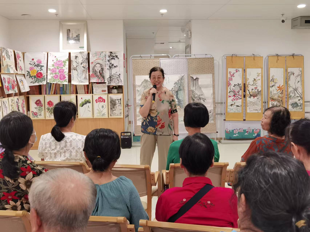 社区长者上台分享国画创作心得