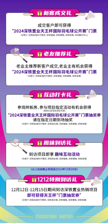 即日起至年末,深铁置业开展新客成交礼、老友推荐礼、互动打卡礼以及趣味到访礼多重好礼赢取观赛门票,比如,新成交客户以及成功推荐新客户的老业主更可获赠“天王杯”门票。此外,“老带新”业主还有诚意厚礼:在社交平台发文宣传项目,可获地铁次卡等礼品;推介新客户到访、成交,最高可获价值四位数的购物卡、管理费抵扣等各类回馈;若完成指定“拉新”任务,则可获价值五位数的丰厚奖励。