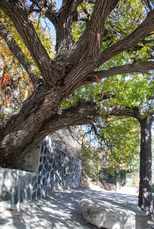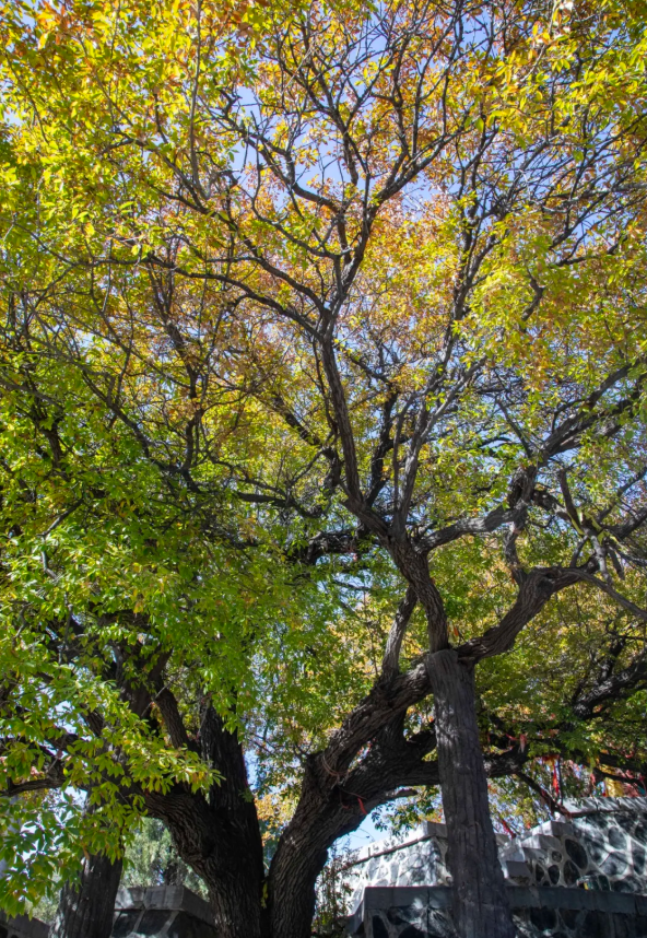 “这三棵都是国家一级保护古树,树龄都在1200年以上,也是我们这里的‘长寿星’。”李老师说,“虽历经沧桑,却依然枝繁叶茂。乡亲们都把健康长寿、幸福美满的愿望寄托给它们,所以我们这儿的耄耋老人特别多。”