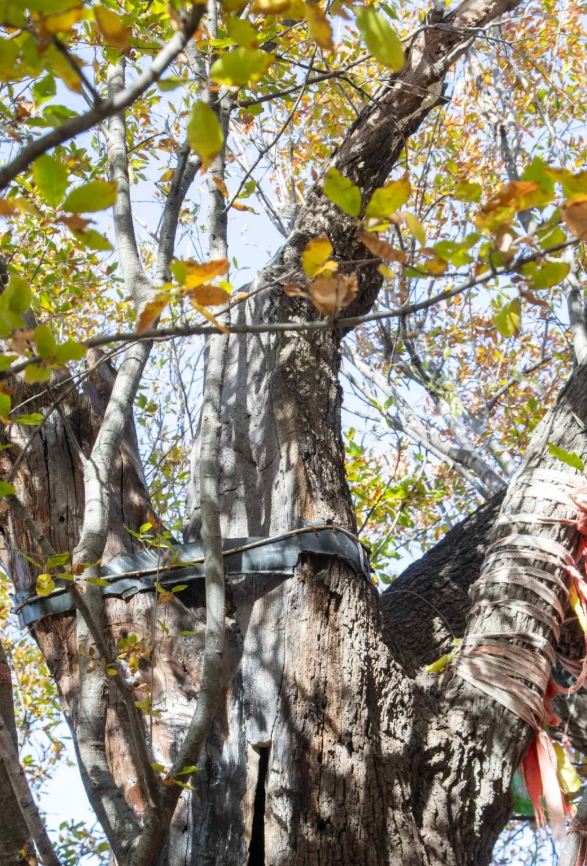 “幸好橿树生命力顽强,它挺过来了。”李老师继续说,这场意外也让大家意识到科学保护的重要性,请来专家为古树安装避雷针,为受伤的树木架起支撑架。
