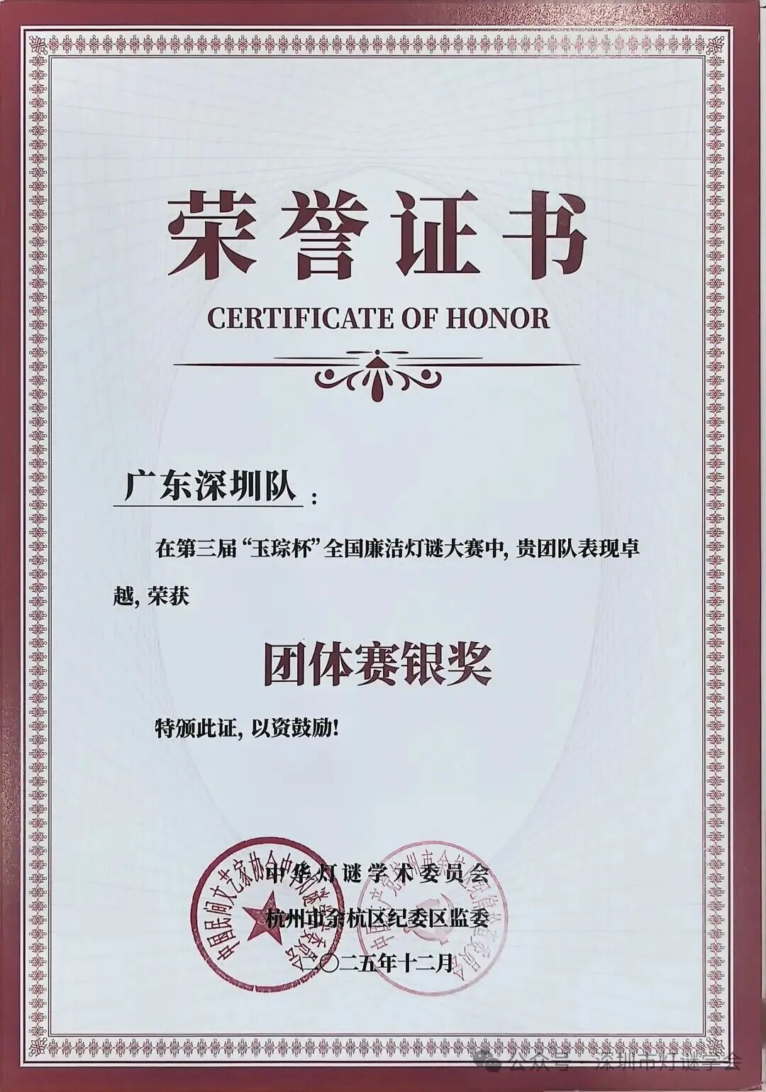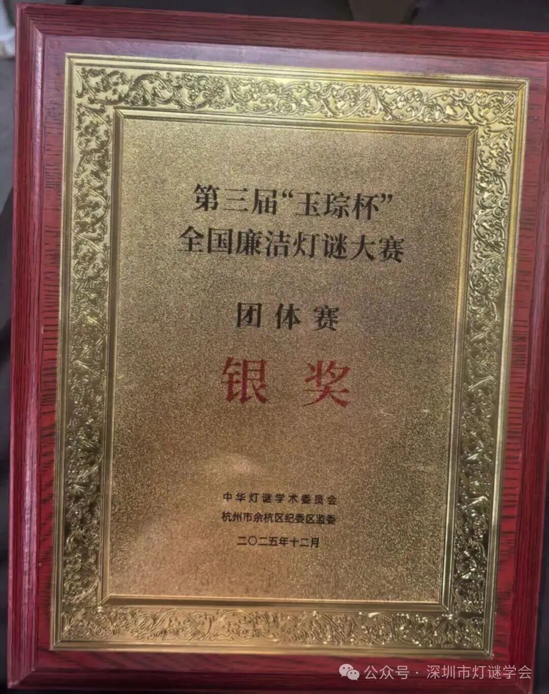 ▲2025年12月19日-12月21日,第三届“玉琮杯”全国廉洁灯谜大赛在杭州余杭区黄湖镇成功举办,深圳市灯谜学会庄毓添、陈培楷、王楷波、陈煜参会,王斌强担任电控赛技术支持。在创作赛中,陈培楷获命题创作奖,陈煜获自荐佳谜奖;在个人赛中,王楷波获金奖,陈培楷、陈煜获铜奖;在团体赛中,由庄毓添、陈培楷、王楷波所组成的广东深圳队获银奖。