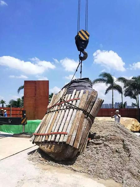 前海石高约2.8米,宽约2.1米,厚约0.65米,搬迁这一庞然大物堪称重中之重,前海石是前海精神的重要象征,在搬迁过程中,确保安全性非常重要。为保证在迁移过程中不磨损、不破裂,整个搬迁过程须小心翼翼。项目部为前海石景石的吊装、修复做出多个操作方案,最终选定横向放置景石临时迁移存放的方案,具体做法是在临时点地面铺500厚砂,在砂中置放枕木,将景石水平放置于枕木上,用木方支撑防滑。在用起重机起吊前,施工人员还用尼龙布对前海石层层包裹,确保万无一失。