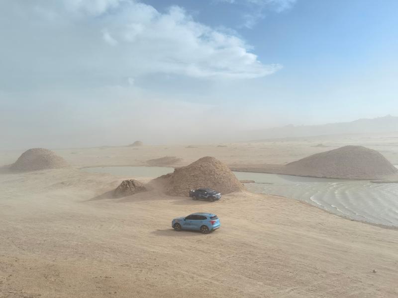 在俄博梁雅丹广阔的大地深处,隐藏着两颗美丽的明珠——流星余迹湖1.0和2.0。1.0是一块黄宝石,2.0是一块绿翡翠。这一天记者组开车深入雅丹地貌区,探访了剧组取景过的黄宝石湖区。一路穿过陡峭的山峰地貌,风光秀丽的雅丹群在飞驰的车窗外时高时低,时隐时现,美不胜收,黄宝石盐湖很快在大家眼前惊艳亮相,中午,艳阳高照,整个流星余迹湖的美景和周围的地貌清晰地展现在眼前。